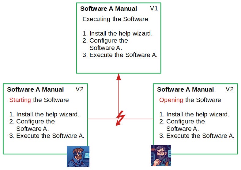 Imagine two people working on the same chapter of the user manual, not knowing about each other.